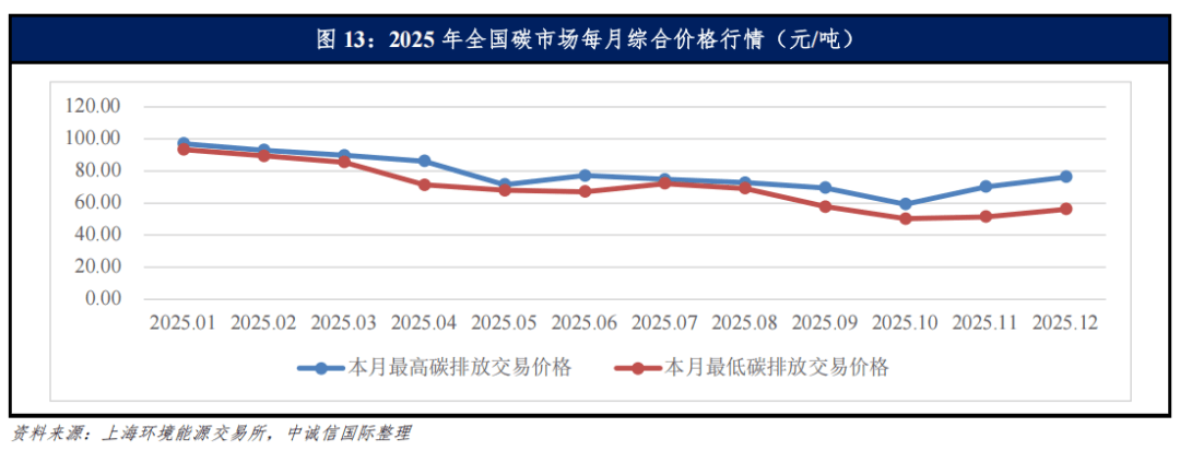 碳排放权交易(以下简称“碳交易”)方面,2025年3月,在发电行业基础上,国务院正式批准将钢铁、水泥、铝冶炼行业纳入全国碳排放权交易市场,碳交易市场覆盖行业范围进一步扩大。2025年8月,中央办公厅、国务院办公厅发布的《关于推进绿色低碳转型加强全国碳市场建设的意见》提出,到2027年,全国碳排放权交易市场基本覆盖工业领域主要排放行业,全国温室气体自愿减排交易市场实现重点领域全覆盖;到2030年,基本建成以配额总量控制为基础、免费和有偿分配相结合的全国碳排放权交易市场,建成诚信透明、方法统一、参与广泛、与国际接轨的全国温室气体自愿减排交易市场,形成减排效果明显、规则体系健全、价格水平合理的碳定价机制。截至2025年末,全国碳排放权交易市场配额累计成交量8.63亿吨,累计成交额576.63亿元,交易量及交易金额快速增长。碳排放配额价格方面,2025年全国碳市场综合价格收盘价在50.34~97.01元/吨之间,期末综合价格收盘价为74.63元/吨,较年初收盘价下降23.45%。在全球碳价普遍下跌的背景下,全国碳排放权交易市场碳价总体保持在合理区间。