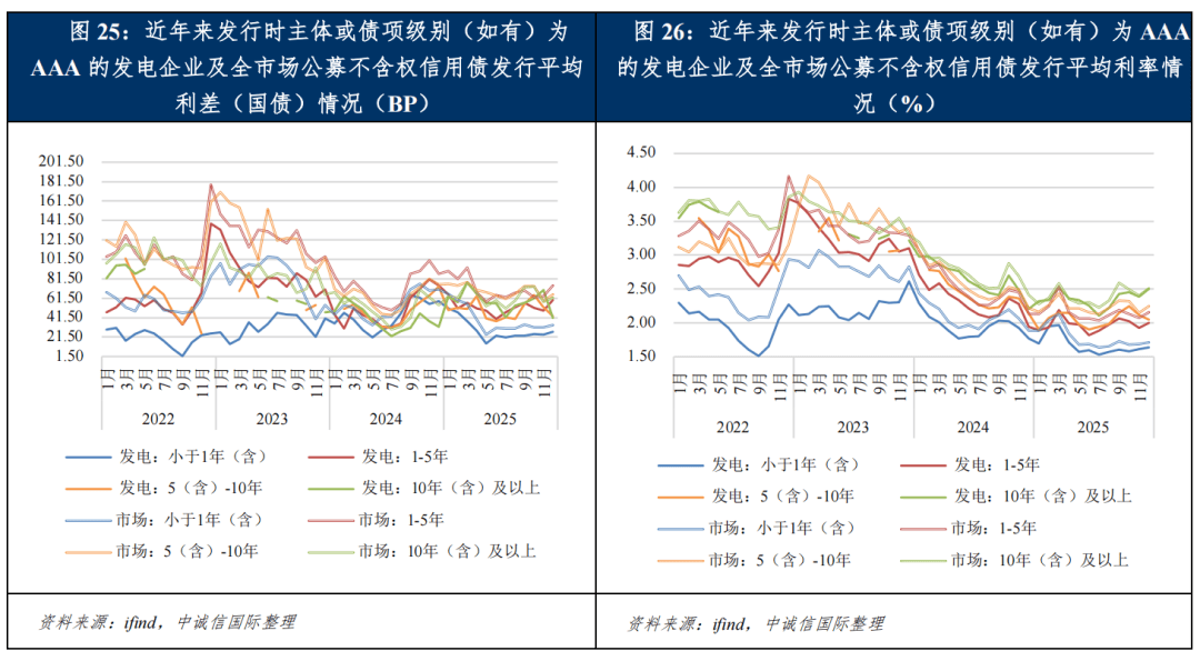 2024~2025年,多重有利因素叠加推动发电企业融资成本走低:一是市场流动性充裕,无风险利率下行,带动整体融资成本下降;二是电力行业盈利稳定性提升,火电受益于煤价下行改善盈利,水电、核电保持稳定盈利水平,叠加电价机制改革落地,投资者对高评级发电主体信心增强,行业信用溢价收窄;三是供给结构优化,融资需求集中于AAA级高信用资质主体,优质供给增加进一步压低利率与利差;四是科创债以及新型政策性金融工具扩容提供低成本资金支持,对市场融资成本形成有效牵引。受益于此,发电企业AAA级债券各期限发行利率持续下行,利差同步收窄,融资成本显著降低。具体来看,小于1年期债券年平均利率从2024年约1.95%降至2025年约1.66%,1~5年期从2.3%降至2.0%,5~10年期从2.36%降至2.09%,且均显著低于市场平均水平。