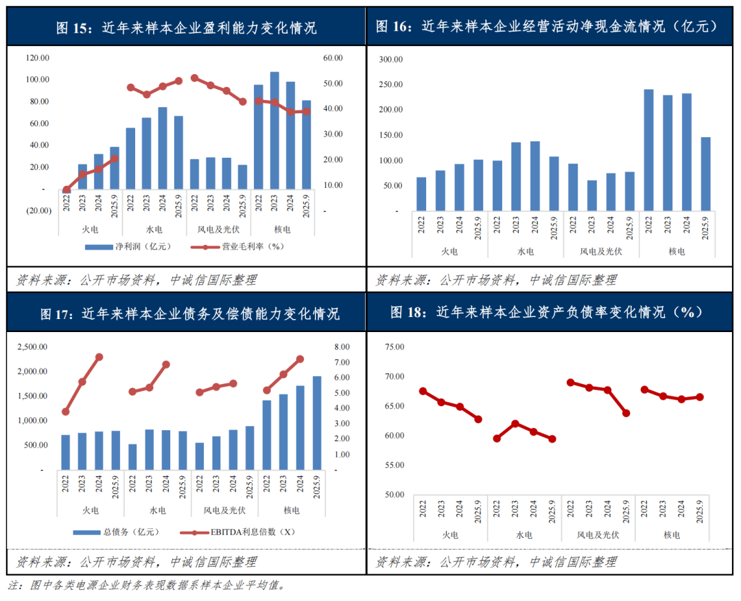 从样本企业财务表现来看,2025年以来行业内企业项目建设持续加码,风光大基地、调节型火电、核电新项目及储能配套设施成为投资核心,融资需求随投资规模扩大保持上升态势,绿色债券及碳中和债券、公募REITs及类REITs、股权融资等多元化工具应用愈发普遍。装机容量及上网电量的增长带动行业内企业营收基数扩大、经营获现水平增加,资本结构及偿债能力整体表现增强。细分来看,不同电源类型企业财务状况分化呈现加剧态势,火电、水电盈利修复超预期,风电及太阳能发电企业面临盈利承压与债务高增的双重挑战,核电企业则保持盈利稳定与投资增长并行的格局,其中: