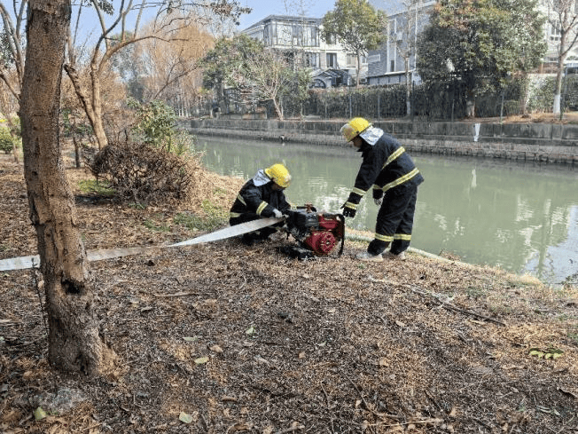 镇绿化市容所接到拉动信息后,迅速联动陈春路微型消防站,启动应急响应,仅用6分钟便赶到指定现场,分工协作实施演练。陈春路微型消防站充分发挥专业优势,通过消防车对林地实施喷水灭火作业,快速压制火情蔓延;林地养护单位携带手抬泵、风力灭火器等应急装备,熟练操作手抬泵同步开展喷水灭火,形成协同作战、立体处置的良好格局,顺利完成此次任务。